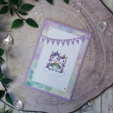 Heute habe ich mal eine etwas andere Karte zur Geburt mit niedlichen Einhörnern zu zeigen. Verwendet habe ich dafür: Stempel: „Einhorn-Minis“ und „Storchenwunder„ Stanzen: „Wimpelkette Willkommen“ und „Aufleger A6 mit Fenster„ Designpapier: „Pastellzauber„ Cardstock: „puderweiß“ und „lila„ Sonstiges: „Strasssteinchen“ Zuerst habe ich mir einen Kartenrohling …