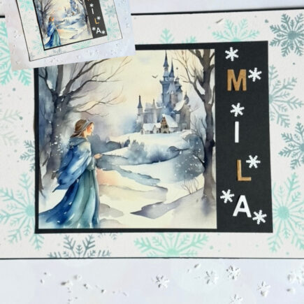 Mit dem neuen Designpapier „Märchenhafte Winterwelt“ habe ich ein Tisch-Set für eine kleine Prinzessin namens „Mila“ gewerkelt: Material: Aus meinem Bestand: Anleitung: Mithilfe von Finger-Pads Stempelfarbe auf die Schneeflocken-Schablone auf Aquarellpapier aufbringen (siehe Foto).Designpapier auf schwarzen Cardstock kleben. Die einzelnen Buchstaben und Schneeflocken ausstanzen und …