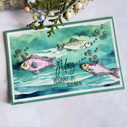 denn „Magie beginnt im Kleinen“: Material: Aus meinem Bestand: Anleitung: Aus weißem Cardstock eine Mattung und aus dem Designpapier ein passendes Motiv zuschneiden und auf die Klappkarte kleben. Den Text und die Blubberblasen auf die Karte stempeln.Auf weißen Cardstock die Fische stempeln, colorieren, ausschneiden und …