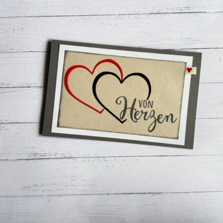 zwei Herzen im 3/4-Takt, zwei Herzen schlagen gemeinsam,zwei Herzen finden zueinander: Material: Aus meinem Bestand: Anleitung: Aus dunkelgrauem Cardstock eine Klappkarte, aus puderweiß und perlmutt crema je einen Aufleger schneiden. Vor dem Aufkleben ein Stück Band einstecken und den perlmutt-crema-farbenen Aufleger-Rand mit schwarzer Stempelfarbe (mit …