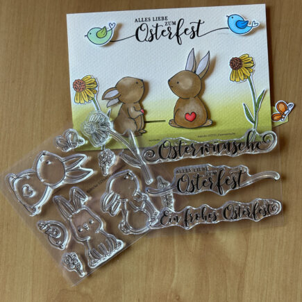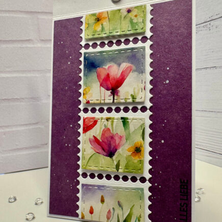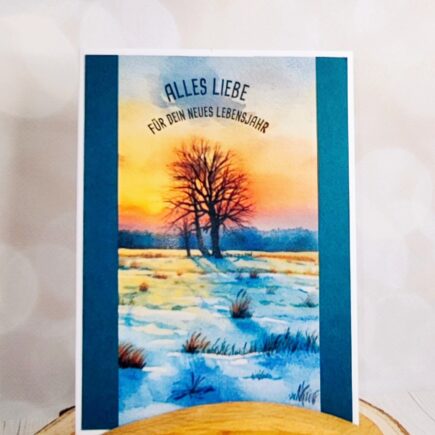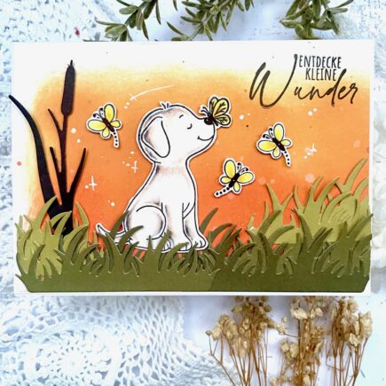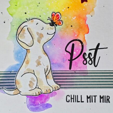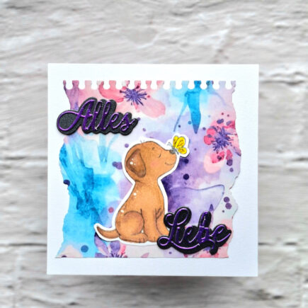 Ist der Kleine nicht super süß? Er stammt aus dem Set Hundeglück und ist auch ganz schnell koloriert. Diesmal habe ich eine Din lang Karte geschnitten und einen Teil des Auflegers leicht mit Wasser angefeuchtet. Auch hier habe ich wieder mein Lieblingspapier Cardstock bermgras benutzt. …
