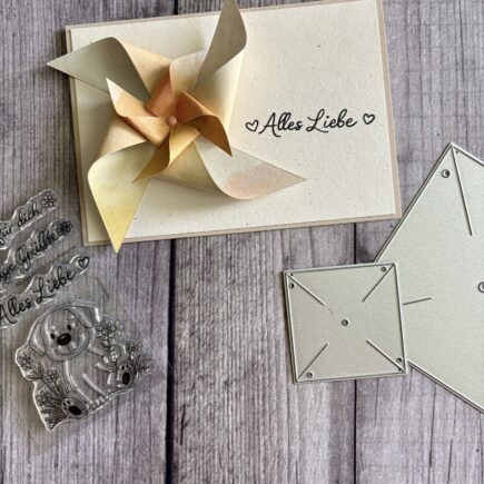 Hallo Ihr Lieben, heute habe ich eine Karte mit dem neuen Windrad-Duo für euch. Für die Grundkarte habe ich Cardstock in Kakao gewählt. Den Aufleger aus Cardstock in Terra Vanille (beide Papiere sind schon bald im Shop erhältlich) habe ich mit dem Schriftzug aus dem neuen Kulricke-Set „Schnüffelblumen“ bestempelt. …