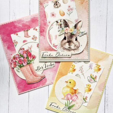 hallöchen da bin ich wieder, heut zeige ich euch 3 Karten mit dem tollen Papier „bunter Ostergruß“ Ich habe mir einige Motive rausgesucht und passend zu diesen verschiedene Hintergrund Papiere zurecht gelegt ,die Größte Martung habe ich mit meiner geliebten A6 Wellenrand Stanze ausgestanzt (ja …
