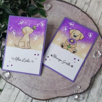 Wieder sind zwei Geburtstagskarten entstanden, diesmal mit süßen Hunden. Verwendet habe ich dafür: Stempel: „Hundeglück“ und „Schnüffelblumen„ Stanzen: „Aufleger A6 mit Fenster„ Cardstock: „puderweiß“ und „violett„ Sonstiges: Embossingpulver weiß, Strasssteinchen, DistressOxides Zuerst habe ich den Kartenrohling aus Cardstock zugeschnitten und gefalzt. Dann habe ich den …