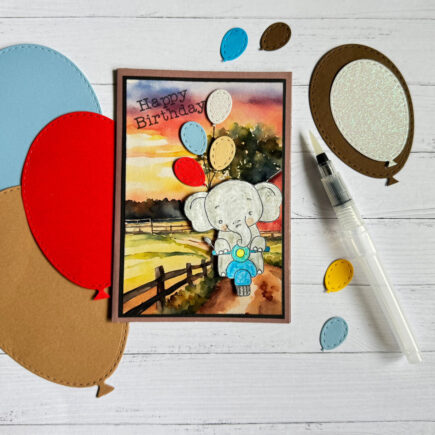 Wer düst da in aller Frühe auf Feldwegen auf seinem Moped zum Geburtstagskind?Unser niedlicher Elefant und er hat jede Menge Luftballons dabei. Meine Materialien: Aus meinem Bestand: Anleitung: Aus dem Design-Papier einen passenden Hintergrund auswählen, zuschneiden und eine Mattung dazu (hier schwarz) auf die Klappkarte …