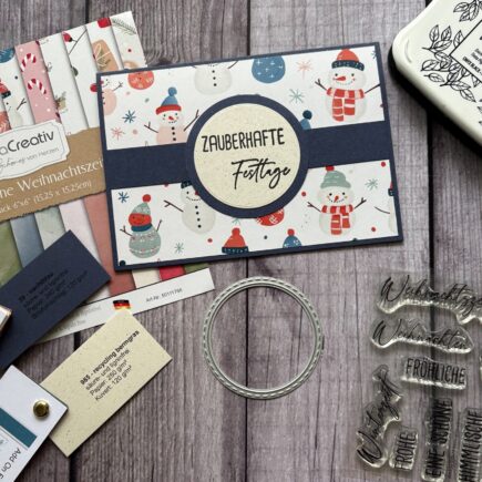 Hallo Ihr Lieben, und schon ist Oktober, also Zeit für die erste Weihnachtskarte. Für die Grundkarte habe ich Cardstock in Nachtblau gewählt, ebenso für den Querbalken und den äußeren Kreis. Aus dem Designpapier „Gemütliche Weihnachtszeit“ habe ich einen Bogen mit den süßen Schneemännern zurechtgeschnitten. Für …
