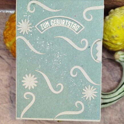 Heute möchte ich Euch meinen ersten Beitrag als Gast Designteam Mitglied zeigen. Da ich Interaktive Karten sehr mag, habe ich eine Drehkarte gebastelt. Den Stempelabdruck habe ich heiß embosst. Mit der Blumen und Blatt Stanze habe ich das Äußer und Innere der Karte gestaltet. Die …