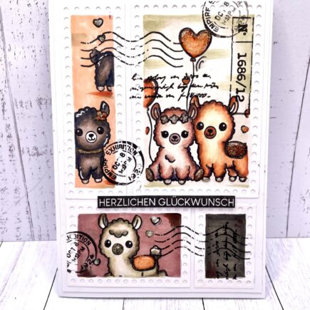 Diese süßen Lamas machen sich ganz zauberhaft auf Minikarten… Verwendet habe ich dafür: Stempel: „Lama-Minis“ und „Beste Wünsche Reverse„ Cardstock: „puderweiß„, „pistazie„, „himmelblau“ und „gelb„ Aus weißem Cardstock habe ich Aufleger in 10x10cm zugeschnitten. Darauf habe ich die süßen Lamas gestempelt und coloriert. Dann wurden …