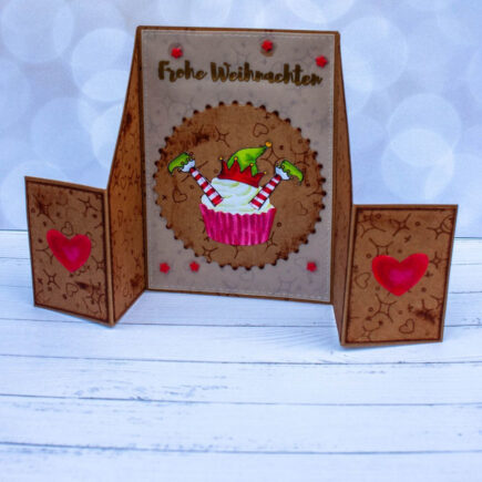 Hallo zusammen Heute habe ich für euch eine andere Kartenform als sonst. Aber schaut selbst… Ihr braucht dafür: Ihr braucht für diese besondere Form einen weißen Cardstock, der wird gefalzt. An der Falz wird nun die XL Stanze angelegt, aber so das die Falz in …