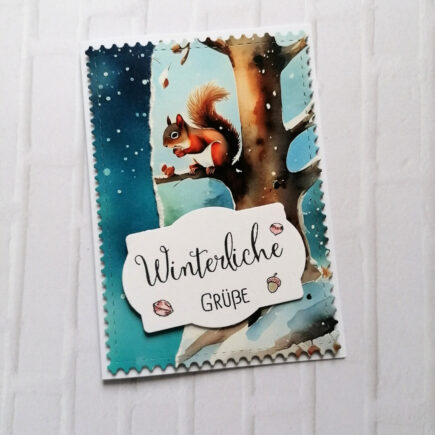Designteambeitrag/enthält Werbung Heute habe ich eine winterliche Karte für euch mit diesem niedlichen Eichhörnchen. Das Motiv ist aus dem Designerpapier „Spaziergang im Winterwald“, wovon ich noch eine Rest hatte. An der linken Seite habe ich einen Rand gerissen. Dann nahm ich mir noch ein Motiv …