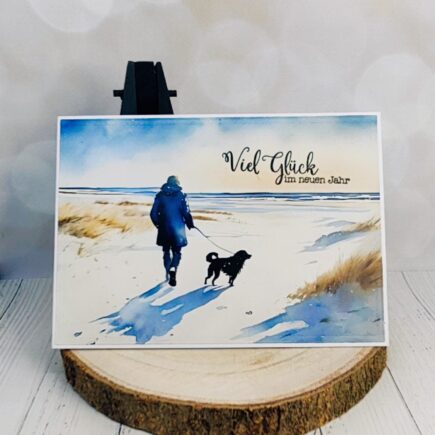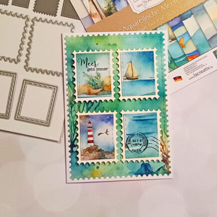 Halli hallo ihr Lieben, passend zum Release zum Januar habe ich für euch eine Karte gewerkelt, mit der neuen Briefmarkenstanze. Was habe ich dafür verwendet? Ganz einfach eine weiße Kartenbasis. Darauf habe ich aus dem DSP Aquarellische Meeresträume und der Stanze Aufleger A6 Briefmarke den …