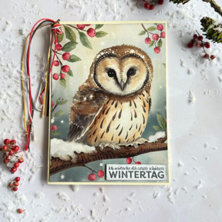 oder auch „zauberhafte Wintereulen“.Ich liebe dieses wunderschöne Designpapier: Material: Aus meinem Bestand: Anleitung: Aus Bastelpapier hellcreme eine Klappkarte herstellen und das Designpapier passend zuschneiden und daraufkleben. Oben links durch die vordere Seite ein eylet setzen und Bänder durchfädeln und verknoten. Text auf weißen Cardstock stempeln, …