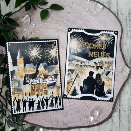 Heute zeige ich Euch 2 Karten die ich zum Jahreswechsel gebastelt habe. Verwendet habe ich dafür: Stempel: „Neues Jahr 2026„ Stanzen: „Wunderkerze„, „Neues Jahr„, „Frohes Fest„, „Aufleger Wellenrand A6“ und „Aufleger Ticket“ Designpapier: „Goldene Silvesternacht„ Cardstock: „puderweiß„, „schwarz“ und „Spiegelkarton gold„ Sonstiges: Strasssteine Zuerst habe …