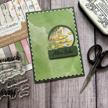 Hallo Ihr Lieben, heute habe ich eine froschige Karte für euch. Für die Grundkarte habe ich Cardstock in Waldgrün gewählt. Darauf folgt ein Aufleger aus dem Designpapier „Streifen schwarz“. In den Aufleger aus dem Designpapier „Tierische Partygäste“ habe ich einen Kreis ausgestanzt und ein Stück …