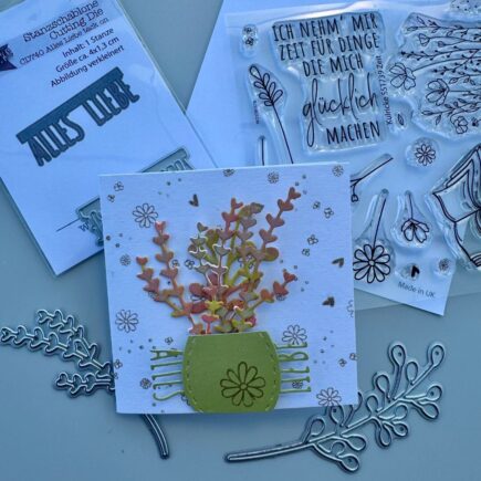 Dafür braucht ihr: Heute habe ich eine kleine Minikarte für euch. Die Karte hat eine größe von 7×7 cm. Den Hintergrund der Karte habe ich mit den kleinen Ministempeln aus dem Stempelset gestaltet. Aus einem Luftballon habe ich eine Vase geschnitten und die Zarten Blätter …