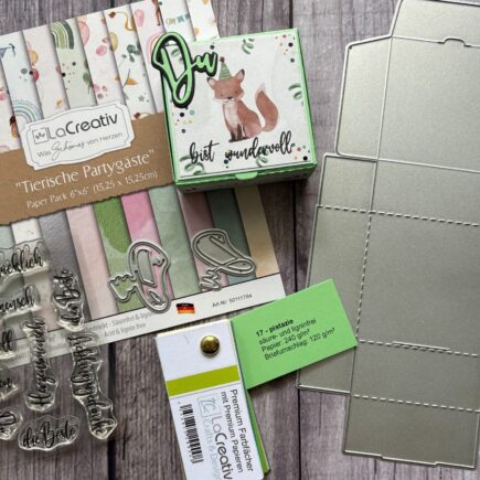 Hallo Ihr Lieben, heute habe ich eine Schachtel für einen wunderbaren Menschen für euch. Für die Grundschachtel habe ich Cardstock in Pistazie mit der Stanzschablone „Pizzabox mittel“ ausgestanzt. Aus einem Bogen aus dem Designpapier „Tierische Partygäste“ von LaCreativ habe ich Aufleger zurechtgeschnitten. Den oberen habe …