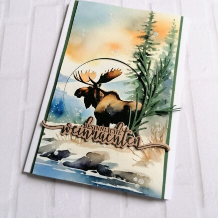 Designteambeitrag/enthält Werbung Heute habe ich eine weitere Weihnachtskarte für euch, allerdings mit diesem tollen Elch im Vokus. Die Grundkarte ist weiß und daurauf kam ein Streifen in grün. Auf diesem kam ein Streifen von dem neuen wundervollen Designerpapier „Spaziergang im Winterwald“. Mit dem kleinen Schneeflockenstempel …