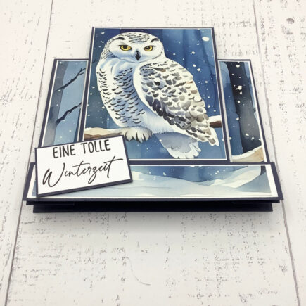 Guten Morgen an meinem Designteam-Mittwoch. Heute habe ich dir eine andere Aufstellkarte, eine sog. Center-Step-Karte. Und für diese Kartenform eignen sich einige Designs aus dem neuen DSP „Spaziergang im Winterwald“ wirklich super. Und ich als Eulenfan hab mich natürlich für die Schneeeule entschieden. Du brauchst …
