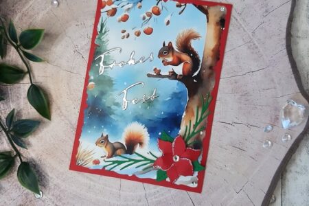 Auch heute habe ich wieder eine Weihnachtskarte mit dem tollen Designpapier „Spaziergang im Winterwald“ für Euch dabei. Verwendet habe ich dafür: Stanzen: „Aufleger Büttenrand„, „Frohes Fest„, „Zarte Zweige“ und „Blumen Set„ Designpapier: „Spaziergang im Winterwald„ Cardstock: „weihnachtsrot“ und „weihnachtsgrün„ Sonstiges: Strasssteinchen, Stickles, Zuerst habe ich …