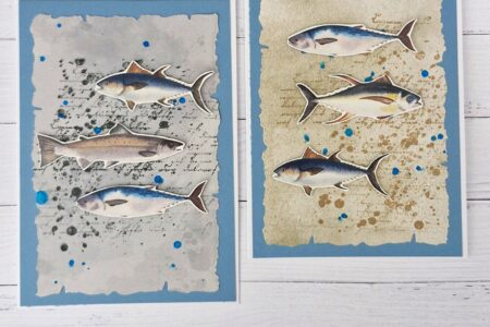 Hallo, heute habe ich 2 Karten mit dem neuen Papier „Anglerglück“ für euch Als erstes habe ich mir mein Motivpapier ausgesucht und anschließend die Fische mit der Schere ausgeschnitten. Als ich das erledigt hatte, habe ich mir die Hintergrund Papiere vorgenommen und erstmal mit Klecksen …