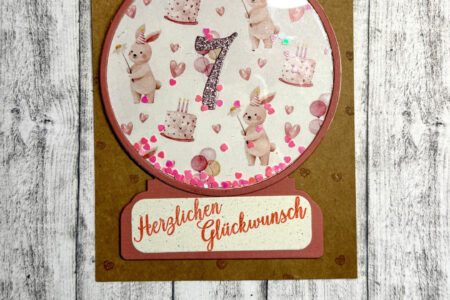 Hallo Ihr Lieben, und schon wieder hatten wir ein Geburtstag in der Familie. Diesmal ein Kindergeburtstag. Dazu habe ich die Stanze „Schneekugelwelt“ verwendet. Für den Hintergrund der Schneekugel habe ich einen Bogen des Designpapier „Tierische Partygäste“ ausgesucht und zu geschnitten. Die Zahl „7“, in der …