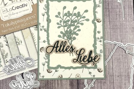 Hallo Ihr Lieben, heute habe ich eine vielseitige Grußkarte für euch. Für die Grundkarte habe ich Cardstock in Eukalyptus gewählt. Darauf folgt ein Aufleger aus einem Bogen aus dem Designpapier „Eukalyptusgarten“. Die beiden oberen Aufleger habe ich mit Bütten-Stanzen von Kulricke ausgestanzt. Dafür kam Cardstock …
