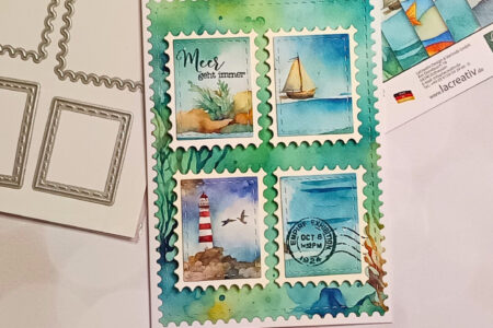 Halli hallo ihr Lieben, passend zum Release zum Januar habe ich für euch eine Karte gewerkelt, mit der neuen Briefmarkenstanze. Was habe ich dafür verwendet? Ganz einfach eine weiße Kartenbasis. Darauf habe ich aus dem DSP Aquarellische Meeresträume und der Stanze Aufleger A6 Briefmarke den …