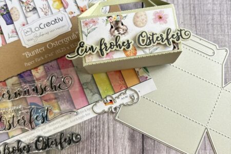 Im Einsatz LaCreativ – Designpapier „Bunter Ostergruß“ Paper Pack 6×6″ – 24 Bogen Kulricke „Frohe Ostern“ Stanze – Craft Die Kulricke Stanzschablone „Aufleger Punkte“ Craft Die Stanze Ostern aus dem StanzenAdventskalender vom letzten Jahr Bestand Folienkarton orange Und loooos Das vielfältige LaCreativ – Designpapier „Bunter …