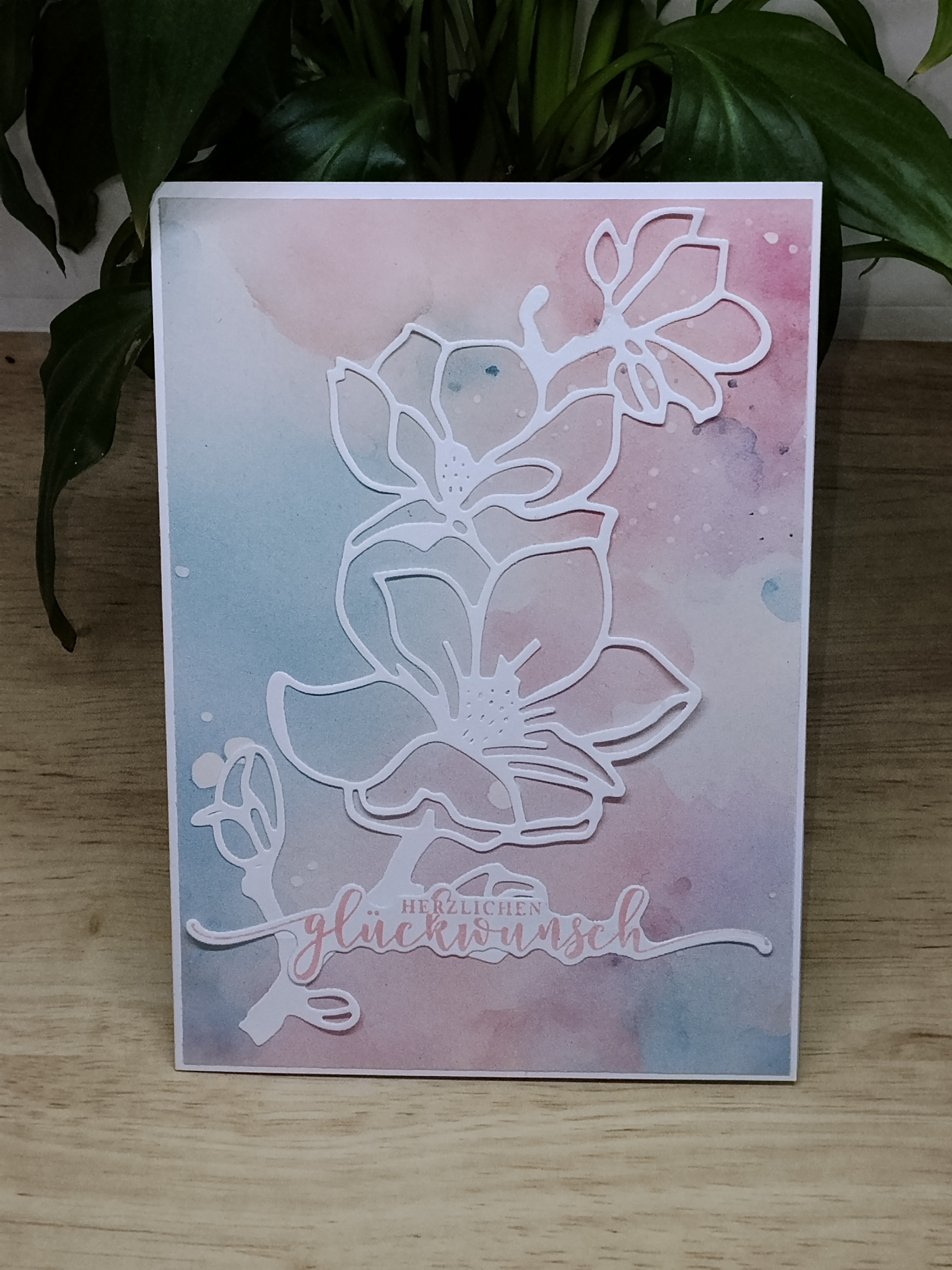 Benutzt habe ich einen das wunderschöne Designpapier "Aquarellblütenwiese", einen Stempel mit passender Stanze aus dem Set "Glückwünsche Geburtstag" und eine ausgestanzte Blume, die noch auf meinem Basteltisch auf ihren Einsatz gewartet hat 🙂