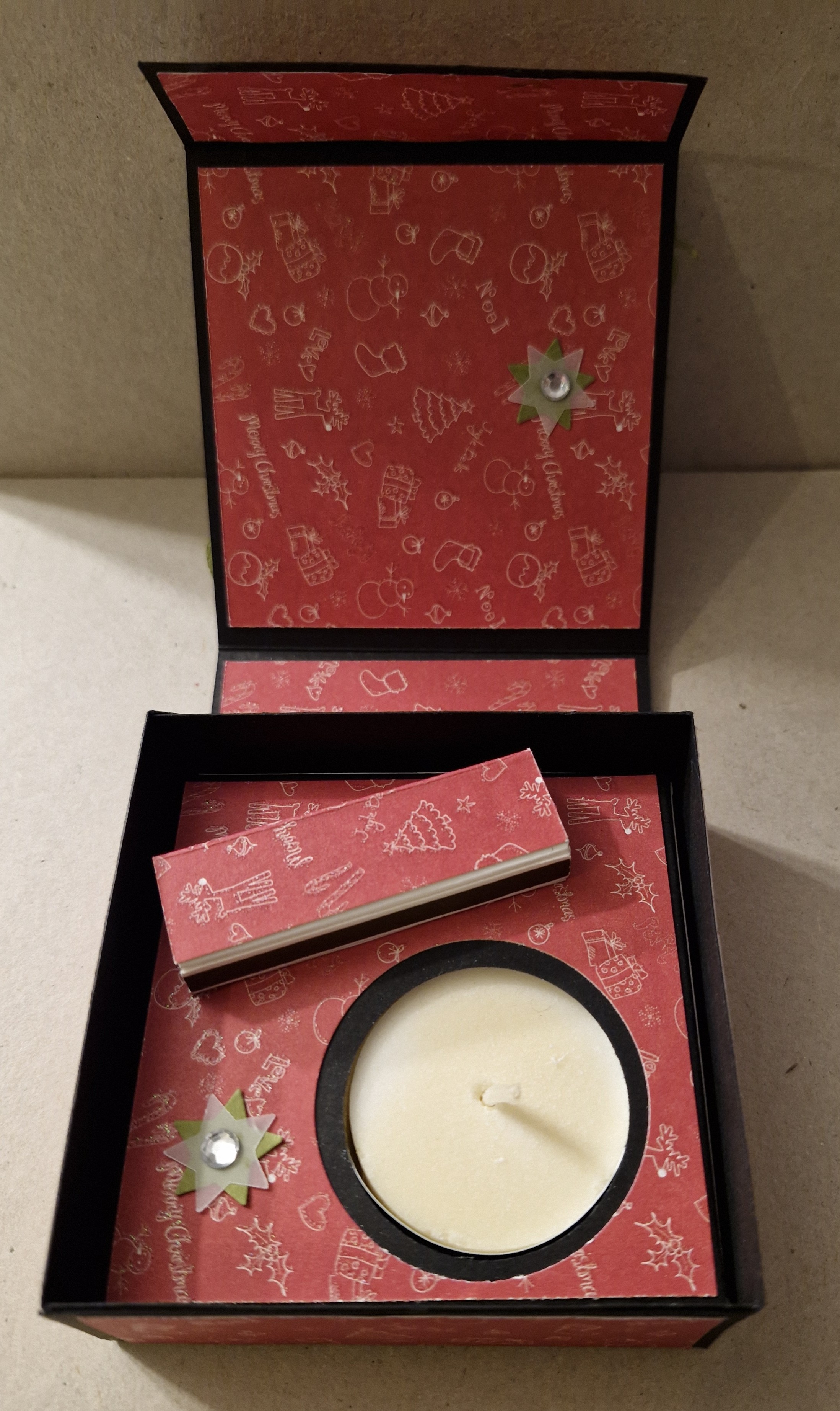 Ich habe ihr zu den Adventssonntagen 4 dieser kleinen Teelicht Schachteln gewerkelt, jeden Sonntag eine andere Farbe mit einem persönlichen Gruß.