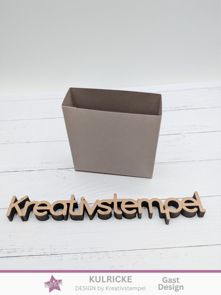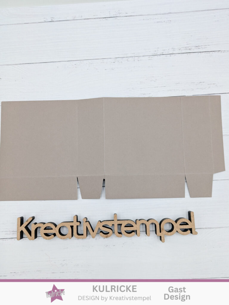 Jetzt aus einem passenden Farbkarton eine Grundverpackung in folgenden Maßen zuschneiden: 20 x 9,5 cm, an der langen Seite bei 7 + 9,5 + 16,5 und 19 cm falzen und an der kurzen Seite bei 7 cm falzen. Dann die Klebelaschen ausschneiden .