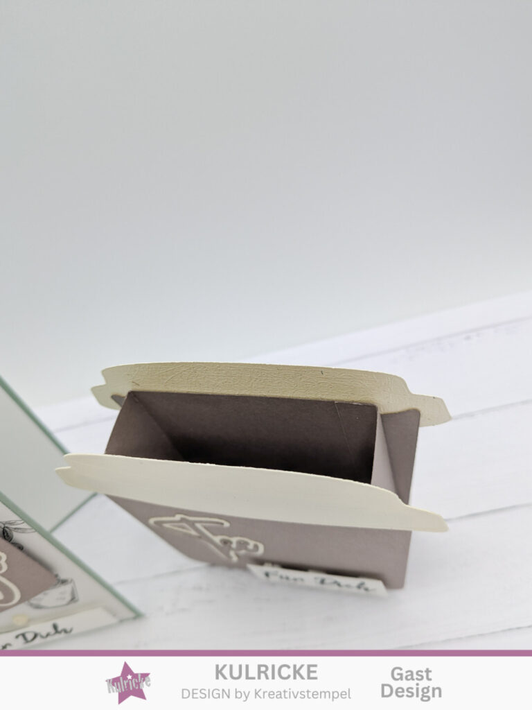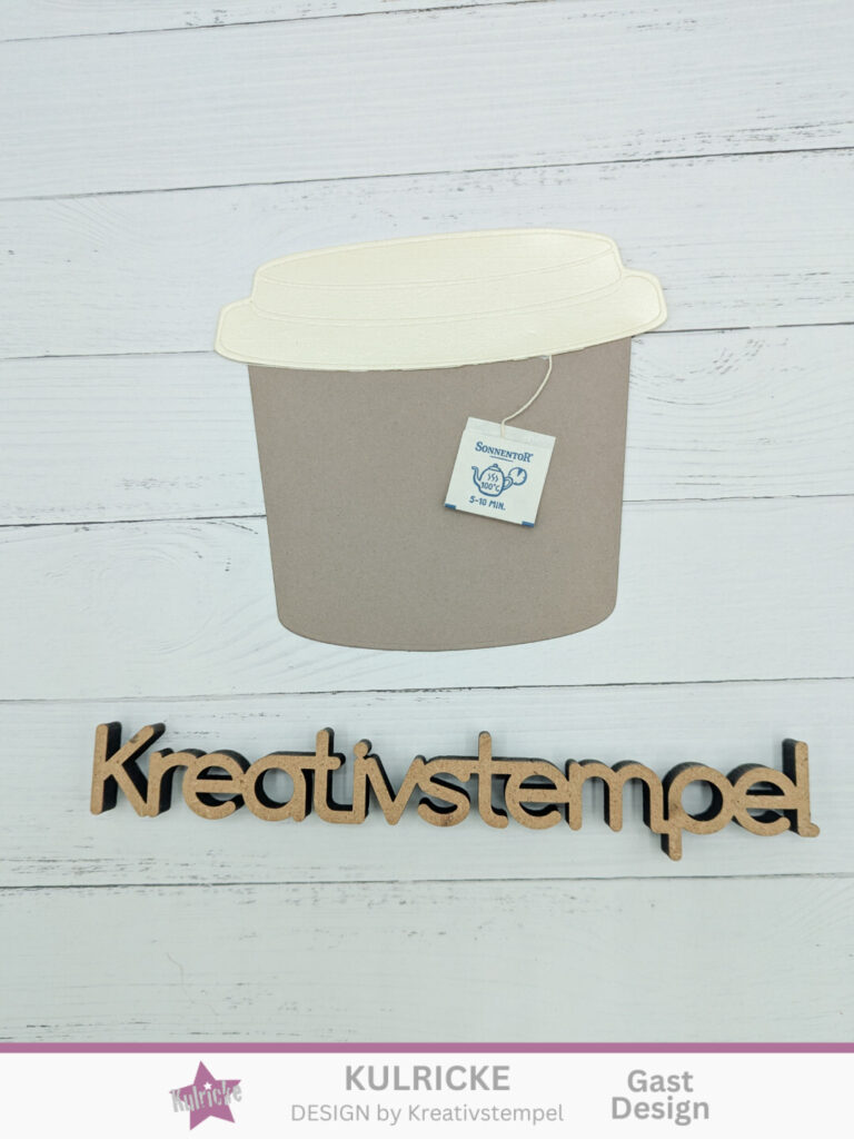 Jetzt aus dem Stanzenset den kleinen Becher mit Deckel ausstanzen und von einem Teebeutel den Faden mit Anhänger abschneiden und unter den Deckel kleben.