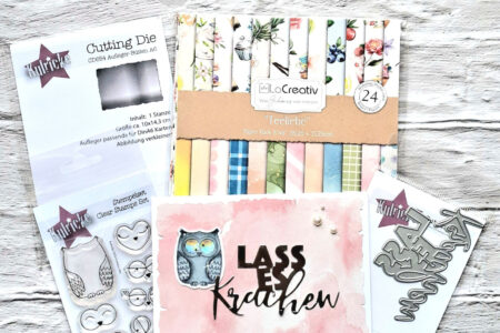 Die Stars LaCreativ – Designpapier „Teeliebe“ Paper Pack 6×6″ – 24 Bogen Kulricke Stempelset „Huhu Uhu“ Clear Stamp „Aufleger-Büttenrand A6“ Stanze – Craft Die „Lass es krachen“ Stanze Bestand Spiegelkarton, Enamel Dots Los geht`s Den „Aufleger-Büttenrand A6“ habe ich mit dem vielseitigen LaCreativ – Designpapier …
