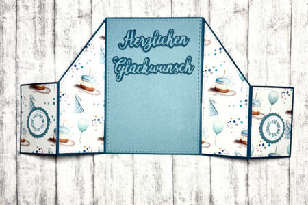 Hallo Ihr Lieben, heute habe ich noch mal eine etwas andere Pop- und Flip- Karte für Euch gebastelt, hier als Geburtstagskarte. Den Kartenrohling habe ich aus dem Cardstockpapier „Tiefseeblau“ zugeschnitten. Nachdem Aufkleben des Designpapiers „Zarter Frühlingsgruß“ auf die Vorderseite, habe ich mit der Kreisstanze ein …