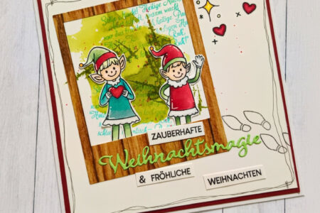 Halli hallo ihr Lieben, heute möchte ich euch eine meiner Lieblingskarten zeigen, die in der letzten Zeit entstanden ist. Hierfür habe ich die kleinen Elfen aus dem Set Jonte der Weihnachtself in Szene gesetzt. Auf einer quadratischen Kartenbasis habe ich den Cardstock weiss und weihnachtsrot …