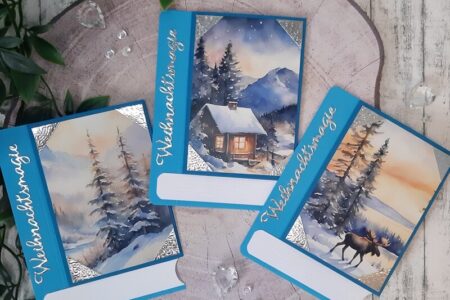 Heute habe ich gleich 3 Karten in Buchform zu zeigen. Verwendet habe ich dafür: Stanzen: „Weihnachtsmagie“ aus dem AK 2024 Designpapier: „Nordische Winterlandschaft„ Cardstock: „puderweiß„, „karibikblau“ und „dodger-blue„ Sonstiges: „Spiegelkarton Silber„ Die Anleitung für diese tolle Kartenform habe ich auf Facebook angezeigt bekommen, leider hab …