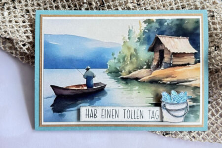 Ruhe, Frieden und eine leckere Mahlzeit. – Angelzeit eben: Material: Aus meinem Bestand: Anleitung: Aus petrolfarbigem Cardstock eine Klappkarte herstellen. Einen Aufleger aus recycling-natur und einen aus elfenbein herstellen und auf die Karte kleben. Den Motivaufkleber aus Designpapier passend schneiden und ebenfalls aufkleben. Einen Text …