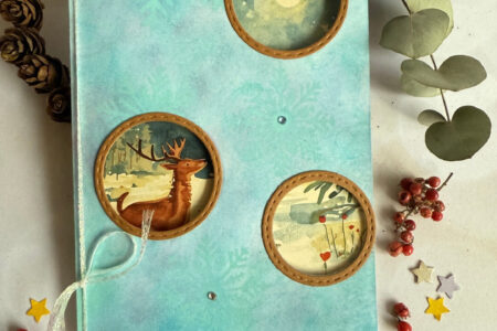 Durch die Öffnungen in der Karte kann man das Reh, das im Mondschein im Winterwald verzaubert wird, schon etwas erkennen.. Materialien: Aus meinem Bestand: Anleitung Vorderseite: Mit den 3 Distress Ink-Blautönen von außen (Rand) nach innen (zur Karte hin) wischen.Den Stencil auflegen und mit Oxice …