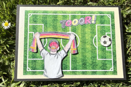 könnte man meinen Beitrag nennen: Material: Anleitung: Aus schwarzem Cardstock eine Klappkarte und aus metallic ivory einen Aufleger herstellen. Aus Designpapier das Fußballfeld und den Fussball ausschneiden. Kartenteile aufeinander kleben. Den Fußballfan und den Text auf weißen Carstock stempeln und colorieren, ausschneiden und auf die …