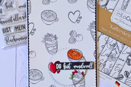 Halli hallo ihr Lieben, wieder Mittwoch und ich zeige euch heute wieder eine Inspiration von mir. Heute habe ich eine Karte mit einem der neuen Designpapiere gemacht. Hier habe ich das Set Kafeesketch hergenommen. Dieses schwarz/weiß Design hat mich sofort an eine Spotlight Karte erinnert …