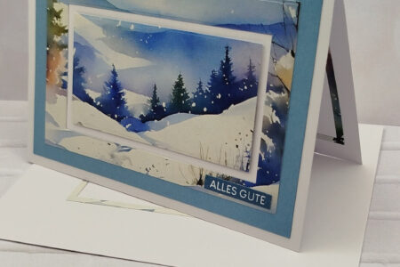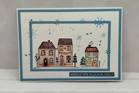 Bei meiner Winterhäuschen Karte habe ich die Rahmen / Rechtecke Stanze genutzt um den Häuschen einen Rahmen zu geben. Die Winterhäuschen habe ich mit Aquarellfarbe bepinselt. Einen Stempelspruch auf die Karte und fertig. Die Stempelsprüche mache ich mir immer auf Vorrat in verschiedenen Farben. Folgendes …