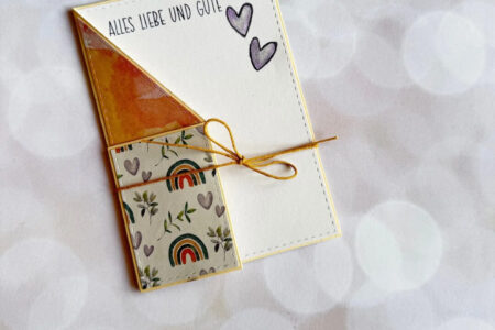 wünschen wir gerne anlässlich schöner Kirchenfeste wie zum Beispiel einer Taufe oder Hochzeit mit unserer 3-fach-Karte: Material: Aus meinem Bestand: Anleitung: Aus gelbem Cardstock die 3-fach-Karte ausstanzen. Karten-Innenteil und Dekoteile ausstanzen (siehe Foto) und aufkleben. Auf die weiße Innenkarte den Gruß und die Herzen stempeln. …