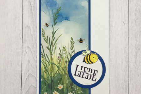 Hallo, heute am ersten Tag des Monats möchte ich den Frühling ein bisschen locken. Dazu habe ich eine einfache Karte gemacht, auf die ich zunächst einen Streifen blauen CS geklebt habe. Dann habe ich einen Streifen DSP aus dem Paket Aquarell Wiesen und Weiden 5mm …