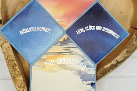 Bei dieser Aufstellkarte falzt man die Vorderseite in der Mitte und klebt einen Kartenaufleger nur auf der unteren Fläche. Im Inneren der Karte klebt man dann noch einen Stopper ein. In meinen Fall hab ich aus dem Babyzauber Papier ein paar Motive ausgeschnitten. Folgendes habe …