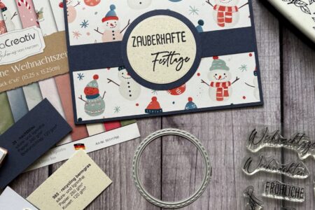 Hallo Ihr Lieben, und schon ist Oktober, also Zeit für die erste Weihnachtskarte. Für die Grundkarte habe ich Cardstock in Nachtblau gewählt, ebenso für den Querbalken und den äußeren Kreis. Aus dem Designpapier „Gemütliche Weihnachtszeit“ habe ich einen Bogen mit den süßen Schneemännern zurechtgeschnitten. Für …
