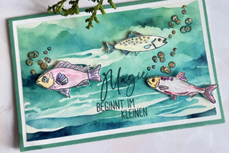 denn „Magie beginnt im Kleinen“: Material: Aus meinem Bestand: Anleitung: Aus weißem Cardstock eine Mattung und aus dem Designpapier ein passendes Motiv zuschneiden und auf die Klappkarte kleben. Den Text und die Blubberblasen auf die Karte stempeln.Auf weißen Cardstock die Fische stempeln, colorieren, ausschneiden und …