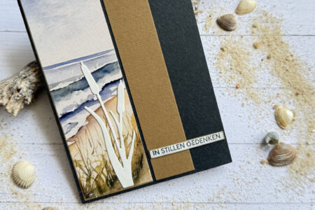 werden leider auch immer wieder benötigt. Diese hier ist für eine Familie, die gerne Zeit am Meer verbringt: Meine Materialien: Aus meinem Bestand: Anleitung: Eine Klappkarte aus Cardstock schwarz, recycling zuschneiden. Je einen Streifen Designpapier und aus Cardstock Struktur -Walnuss schneiden. Das Designpapier habe ich …