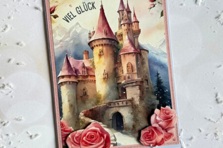 Ganz verzaubert liegt es da, das „Rosenschloss“. Ob dort Dornröschen schläft? Material: Aus meinem Bestand: Anleitung: Aus Cardstock altrosa eine Mattung ausstanzen und auf die Klappkarte kleben. Aus Designpapier das Motiv ausschneiden und auf die Mattung kleben.Text aufstempeln. Weitere Rosen aus Designpapier ausschneiden und aufkleben. …