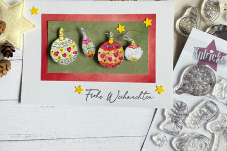 … an einer Schnur aufgefädelt. Eine hübsche Deko auch für eine Weihnachtskarte: Materialien: Aus meinem Bestand: Anleitung: Die Kugeln auf Aquarellpapier stempeln und mit Aquarell-Buntstiften colorieren, ausschneiden und auf einem Drahtstück auffädeln. Aus Designpapier die beiden Mattungen zuschneiden. Den Draht von hinten auf der oberen …