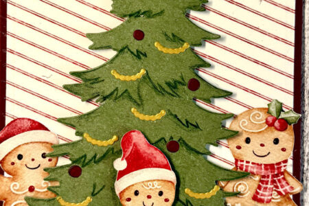 Hallo Ihr Lieben, Familie Lebkuchen wartet am 12.12. (quasi Halbzeit) schon am Weihnachtsbaum und kann es kaum noch erwarten. Der Baum ist auch schon geschmückt, es fehlen nur noch die Geschenke. Den Kartenrohling habe ich aus einem dunkelroten Farbkarton aus meinem Bestand zugeschnitten. Als Aufleger …